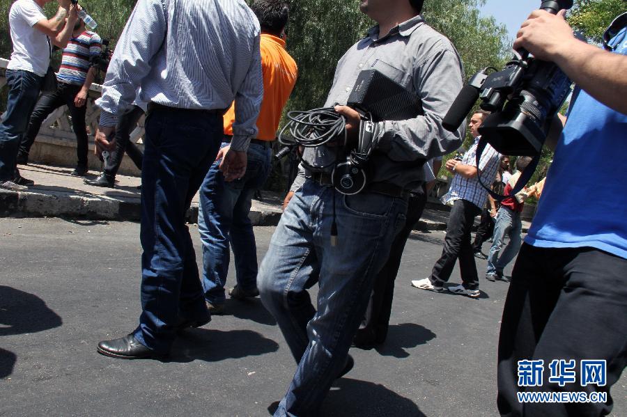 7月18日,在敘利亞首都大馬士革,記者聚集在發生爆炸的敘利亞國家安全總部附近。據敘利亞通訊社18日報道,位于首都大馬士革的敘利亞國家安全總部當天上午遭到自殺式爆炸襲擊,敘國防部長拉杰哈遇襲身亡,另有多名政府高級官員受傷。新華社發(哈澤姆攝)