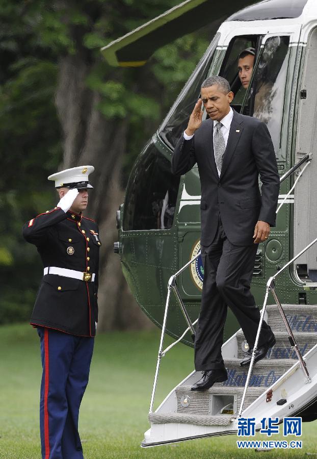 7月20日,在美國首都華盛頓,美國總統奧巴馬(右)抵達白宮南草坪。在美國科羅拉多州發生重大槍擊事件后,美國總統奧巴馬當日提前結束在佛羅里達州的競選行程,返回白宮應對這一事件。 新華社記者張軍攝