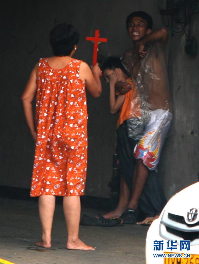 7月21日,在菲律賓大馬尼拉地區奎松市,一名男子劫持人質,該男子的母親在旁勸說。當日,奎松市發生一起人質劫持事件。拉米爾·帕爾帕然用冰錐劫持了一名9歲的男孩,當地警方派出談判專家和該犯罪嫌疑人的母親對其進行勸說,最終使其屈服并逮捕了他。9歲男孩被劫持近7小時后受輕傷,被迅速送往醫院接受治療。新華社發(烏馬利攝)