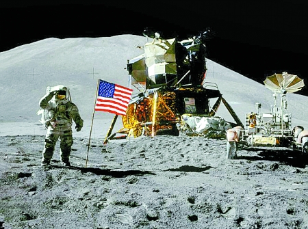 中國日報供本報特稿 據英國《每日郵報》網站7月29日報道,在上世紀60年代到70年代美國的6次登月之旅中,每一次宇航員都會在月球表面插上一面國旗,作為美國成功登月的標志。從最新照片可以看到,除1969年第一次成功登月后留下的那面國旗外,其余5面仍然直立在月球上。