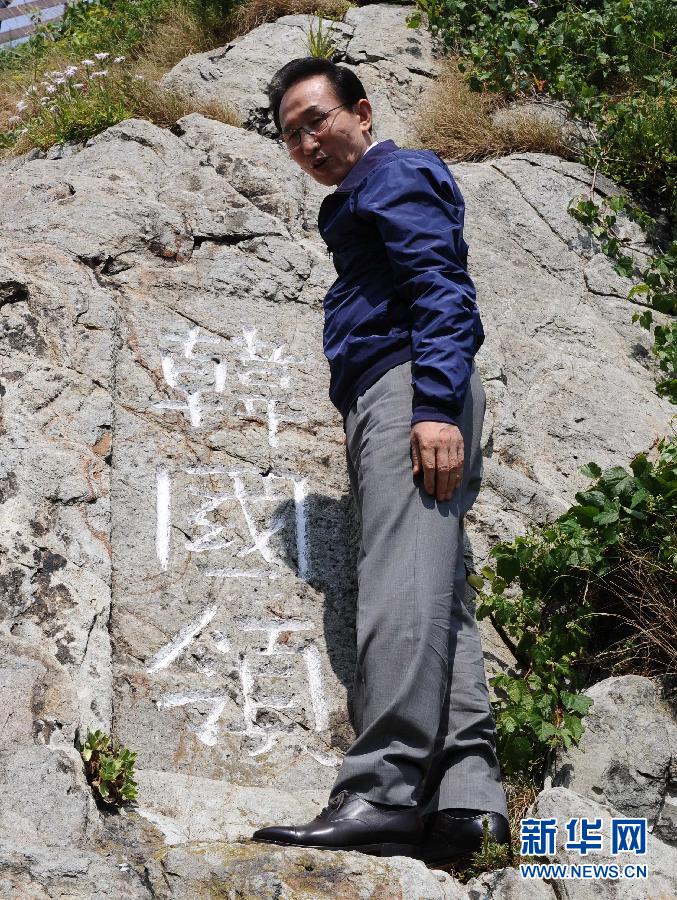 8月10日,韓國總統李明博登上與日本存在主權爭議的獨島(日本稱竹島),仔細觀看一塊刻有“韓國領”字樣的巖石。