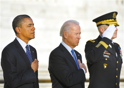 奧巴馬和拜登赴阿靈頓國家公墓為陣亡將士敬獻(xiàn)花圈并默哀。