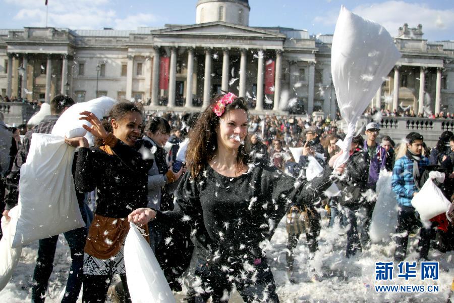 4月6日,人們在英國倫敦特拉法加廣場參加“枕頭大戰”。新華社發(高塔姆攝)