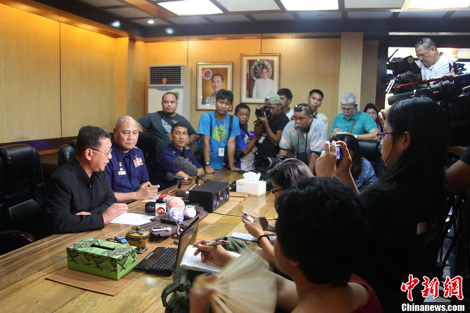 5月10日,菲律賓海岸警衛隊召開記者會,首度公開對外承認是菲海岸警衛隊人員9日開槍射擊一艘臺灣漁船,造成船上一名臺灣漁民死亡。圖為發布會現場。菲海岸警衛隊聲稱,菲方人員是先開槍警告,后又開槍射擊船上機器設備,對遇難的臺灣漁民家屬表示同情,菲方保證會進行透明、公正的調查。中新社發 張明 攝