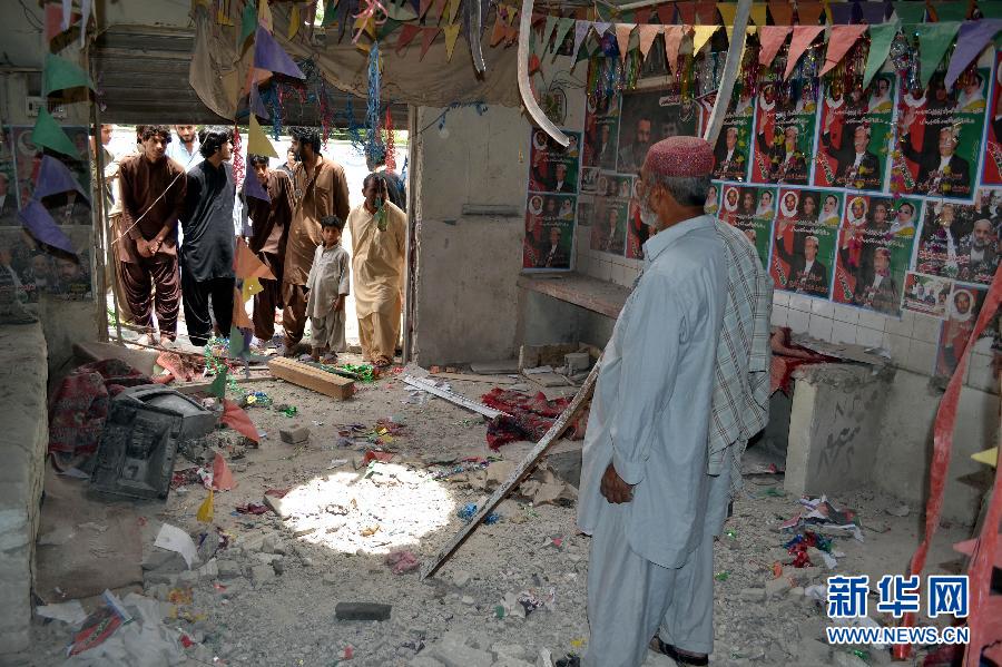5月10日,在巴基斯坦西南部城市奎達,人們聚集在發生爆炸的巴基斯坦人民黨競選辦公室內。當日,奎達的一處巴基斯坦人民黨競選辦公室發生爆炸,造成5人受傷。巴基斯坦定于11日舉行國民議會和地方議會選舉。 新華社發(阿薩德攝)