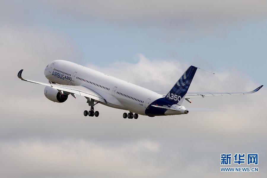 這是6月14日在法國圖盧茲布拉尼亞克機場拍攝的進行首飛的空客首架A350XWB寬體飛機。歐洲飛機制造商空中客車(空客)公司制造的首架A350XWB寬體飛機于當地時間14日10時在法國圖盧茲布拉尼亞克機場起飛,執行其首次測試飛行任務。空客A350XWB寬體飛機系列是空客全新中遠程飛機系列,由我國企業參與設計和制造。與現有同級別飛機相比,A350XWB寬體飛機的燃油效率提高25%,節省燃油,同時減少排放。新華社發(陳誠攝)