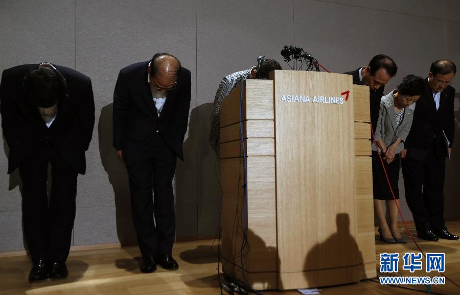 7月7日,在韓國首爾韓亞航空總部,韓亞航空公司社長尹永斗(左三)等公司負責人就飛機失事向國民鞠躬道歉。當日,韓國亞洲航空公司社長尹永斗在首爾韓亞航空總部舉行新聞發布會,向媒體介紹失事客機情況,并向失事客機的乘客和家屬以及全體國民道歉。新華社/路透