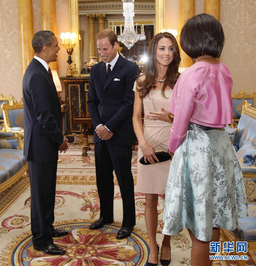 2011年5月24日,在英國倫敦白金漢宮,美國總統奧巴馬(左一)及夫人米歇爾(右一)與剛剛結束蜜月的威廉王子(左二)及王妃凱特(右二)會面。 2011年4月29日,當凱特·米德爾頓在威斯敏斯特大教堂與英國威廉王子步入婚姻殿堂,又一個現代版“灰姑娘”的童話故事打動了無數人的心。婚后英倫王妃凱特的一舉一動都成為媒體的焦點。在服裝搭配上,凱特王妃很有自己的見解,她穿著打扮的風格也成為眾多年輕姑娘效仿的對象,甚至被時尚界稱為“凱特效應”。據報道她某次身著售價175英鎊的某品牌平價駝色禮服裙在白金漢宮會見到訪的奧巴馬夫婦,照片一公布,這件禮服裙所屬品牌的網站立刻被蜂擁而至的消費者擠爆,所有分店的該款裙子被搶購一空。整體色彩的統一與呼應,服裝合身的剪裁,精心選擇的巧妙配飾,打造出凱特王妃優雅、簡潔、大氣、端莊的穿衣風格。新華社/路透(程婷婷編輯)