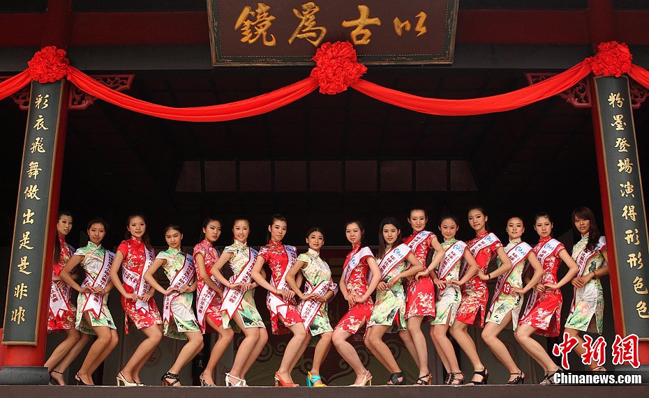 6月17日,正在河南鄭州清華憶江南參加2012環球比基尼小姐大賽華中賽區總決賽的44位佳麗,與河南旗袍會聯手舉行一場別開生面的旗袍秀。中新社發 錢興強 攝
