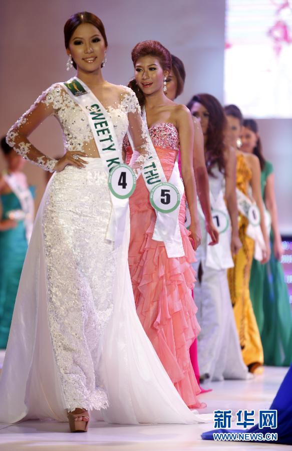 2月24日,身著晚裝的選手在仰光參加2013緬甸國際小姐比賽。 新華社發(吳昂攝)