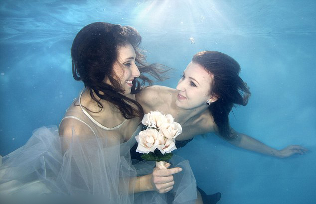“消滅婚紗”攝影在英國流行已久。人們在婚禮結束后用泥巴、顏料、火等毀壞婚紗來達到彰顯個性的效果,同時也象征著他們對婚姻永恒的承諾。作為“消滅婚紗”攝影的一種新形式,拍攝水下婚紗照目前在英國漸成潮流。由于其能展現出新娘超凡脫俗之美,并且破壞性較小,更容易被人們追捧。報道稱,英國水下婚紗攝影的領軍人物、著名攝影師露西·雷(Lucy Ray)表示,進行水下拍攝的婚紗經過簡單干洗之后就可以完好如初。如果新娘不愿穿自己的婚紗進行拍攝,他們也可以為新娘提供婚紗。露西的最新合作者是英國著名的短婚紗設計師托比·漢娜(Tobi Hannah),他們將薄紗和綢緞結合在一起,拍攝出了一系列讓人驚嘆的水下婚禮照片。
