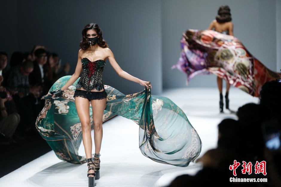 3月30日,模特在中國國際時裝周(2014/2015秋冬系列)上展示設計師胡社光設計的作品。當日,以“蝶”為主題的絲格麗·胡社光2014新品發布會在北京舉行。中新社發 盛佳鵬 攝