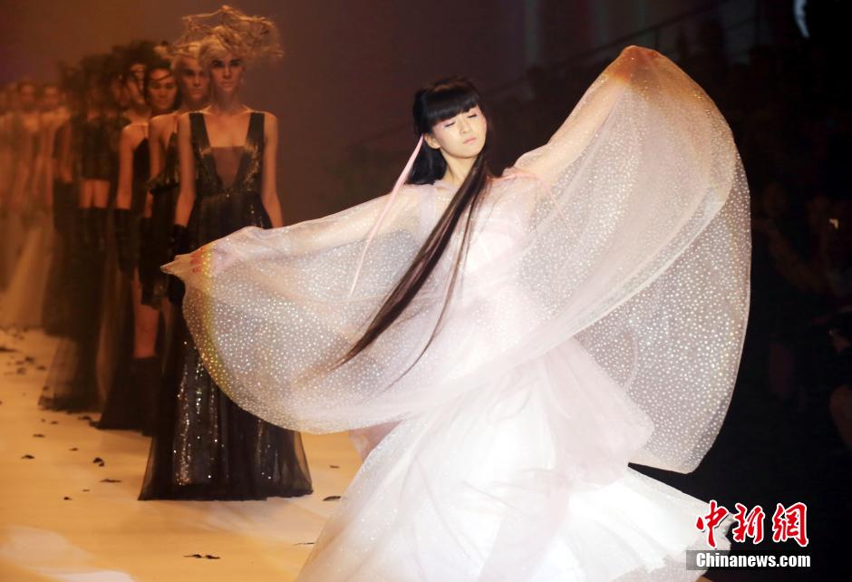 4月10日晚,舞者“小彩旗”作為嘉賓模特亮相上海時裝周,也穿上婚紗壓軸登場。潘索菲 攝 4月10日晚,舞者“小彩旗”作為嘉賓模特亮相上海時裝周,也穿上婚紗壓軸登場。潘索菲 攝 4月10日晚,舞者“小彩旗”作為嘉賓模特亮相上海時裝周,也穿上婚紗壓軸登場。