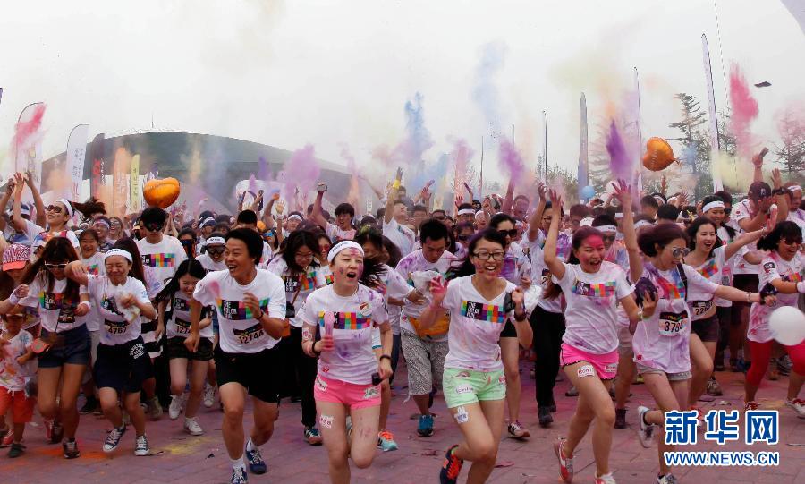 6月21日,上萬名中外友人齊聚北京園博園參加5公里彩色跑運動。彩色跑是一項娛樂項目,2011年發源于美國,跑步距離為5公里,每公里設置一個彩色站,當選手跑步或步行至彩色站時,由工作人員及志愿者向參與者拋灑彩色粉末。它融合了跑步和色彩,與傳統跑步競速相比,更強調“參與、娛樂和色彩”的重要性。中新網記者 金碩 攝