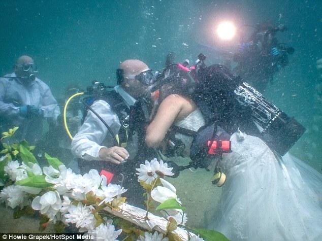 據(jù)英國(guó)《每日郵報(bào)》8月11日?qǐng)?bào)道,美國(guó)佛羅里達(dá)州52歲的Bill Frenier和32歲的Lizbeth Espejo Frenier是一對(duì)瘋狂的潛水愛(ài)好者,于是他們決定在大西洋中舉辦婚禮。這對(duì)具有冒險(xiǎn)精神的美國(guó)夫婦,新娘穿著婚紗,新郎身著禮服,在9米水下結(jié)為夫婦。一身潛水裝備的治安官及他們的親友見(jiàn)證了這個(gè)浪漫的過(guò)程。