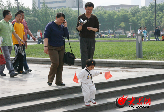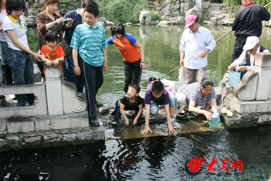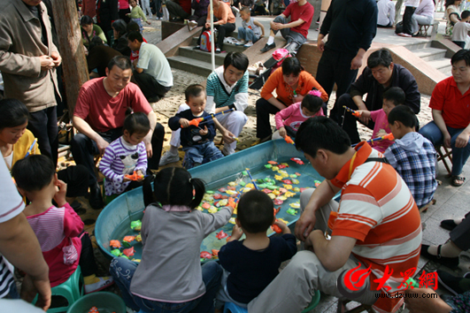孩子們在泉城廣場玩釣魚游戲