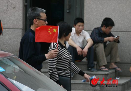 市民手拿紅旗走在泉城路上