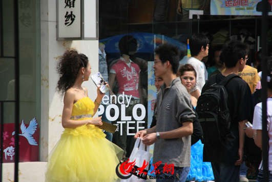 身穿婚紗的影樓服務人員沿街促銷