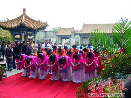 18日上午,山師附中50名18歲青年,參加了在府學文廟大成殿前舉行的首次“齊魯青年成人立志”儀式。參禮學生身著漢代古裝,在大成殿前敬拜孔子,敬謝父母。 記者 殷亞楠 攝
