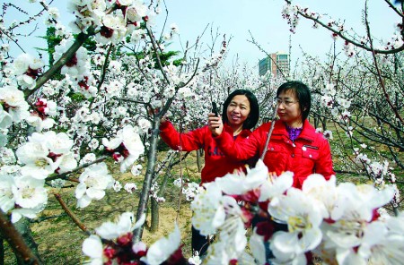3月23日,在濰坊市虞河岸邊,兩位市民正在欣賞盛開的杏花。據了解,該處為虞河“石橋漱玉”景區,內建有杏花苑,每到這個季節,杏花開放、飄香,總引來不少市民觀賞。