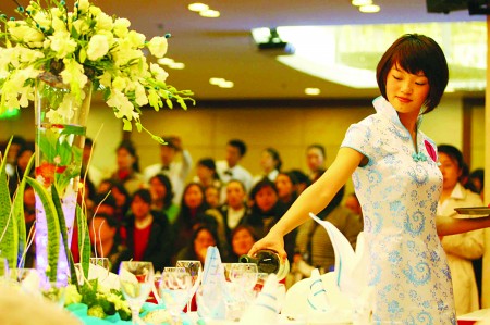 30日,幾位旅游專業(yè)的參賽選手只花了十幾分鐘,就將自己設(shè)計(jì)的西餐宴會(huì)臺(tái)面布置完畢,精巧別致的設(shè)計(jì)讓人耳目一新。據(jù)了解,60位旅游專業(yè)的職校生在2009年青島市中等職業(yè)學(xué)校職業(yè)技能大賽中進(jìn)行了中、西餐宴會(huì)擺臺(tái)、中式做床的才藝PK,爭(zhēng)奪“技能之星”稱號(hào)。
