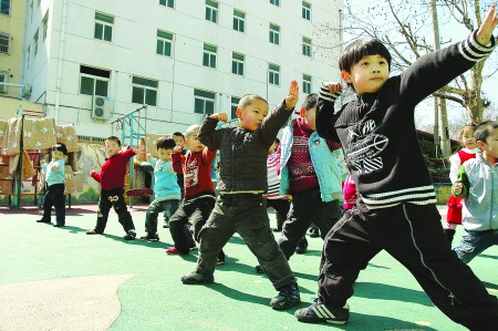 4月1日,煙臺市市級機關幼兒園的小朋友們正在練習武術,用加強體育鍛煉來增強免疫力。近日,我國部分地區發生了手足口病疫情,為遏制和預防傳染病,幼兒園每天都進行晨檢,踩消毒墊換鞋才能進教室,餐具要用84消毒液清洗再放到消毒柜,教室和臥室都用紫外線消毒,陽光好的話都要曬被子,加大對學生預防傳染病和衛生常識教育等,從細節上預防傳染病。