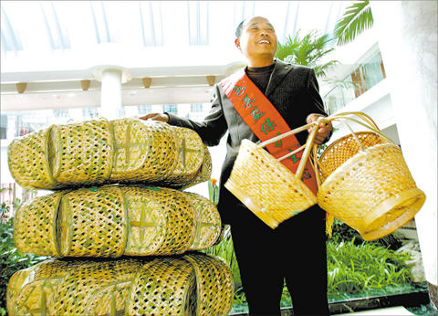陳飛,一個提出“重提竹籃、提倡環!钡拿耖g環保人士,給人送菜籃子這事,他可不是頭一遭了。早在2007年9月在中央電視臺的節目現場,陳飛就給國務院副總理曾培炎送過菜籃子,并受到了曾培炎的贊賞。這次開兩會,陳飛把56個竹籃分別送給56個民族的代表,意在宣傳少用塑料袋,給2987位代表每人送了一條手帕,意在提倡少用紙巾,節約資源。