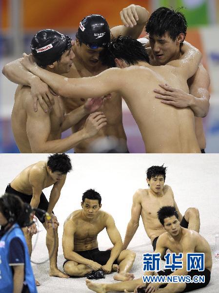 韓國隊、哈薩克斯坦隊分獲亞、季軍(拼版照片)。上圖是中國隊接力選手比賽后激動地擁抱在一起慶祝。新華社記者費茂華攝 下圖是在得知成績被取消后,中國隊選手默默無語。新華社記者格桑達瓦攝