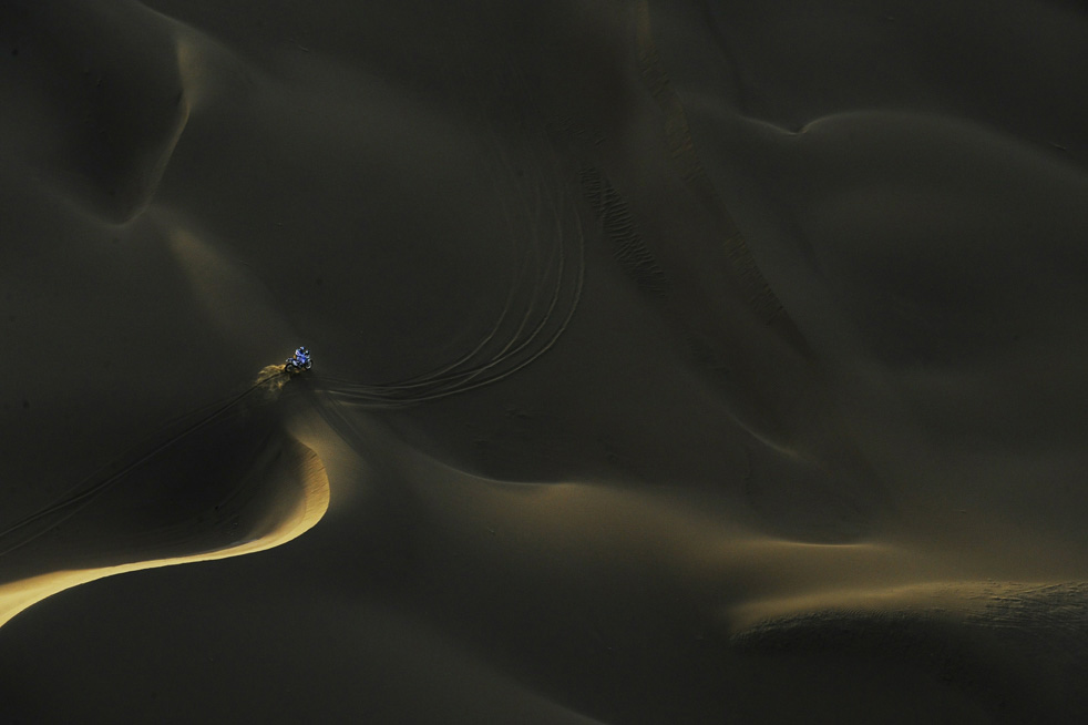 2011年1月7日,智利騎手弗蘭西斯科·洛佩茲·孔塔爾多(Francisco Lopez Contardo)駕駛著自己的阿普利亞(Arpilia)機車,正在穿越智利境內從伊基克至阿里卡的第六賽段。法新社/蓋蒂圖片社/Daniel Garcia