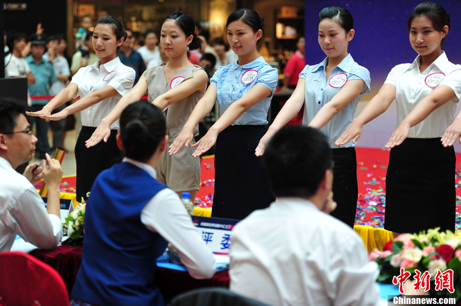 11日上午,中國民航史上最大規模的空乘招募活動——第六屆空姐新人秀廣州選區啟動海選活動,今年南航計劃在中國十大選區招收一千名空姐和五百名空少。圖為評委仔細觀察選手肢體。中新社發 柯小軍 攝