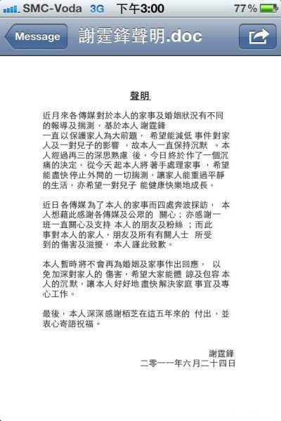 鋒芝婚姻近期頻遭考驗,不斷傳出負面消息,但雙方當事人一直未親自回應。6月23日,張柏芝打開金口,向香港報紙坦陳謝霆鋒的真面目,說他一直以來好丈夫、好爸爸的形象都是演的。24日下午15時左右,謝霆鋒的公開聲明就呈現在經紀人霍汶希的微博上。但對于兩人之間發生何事,謝霆鋒沒有明言,也沒有回應張柏芝的指責。他說,自己將從今天起處理家事,并且感謝張柏芝5年的付出。