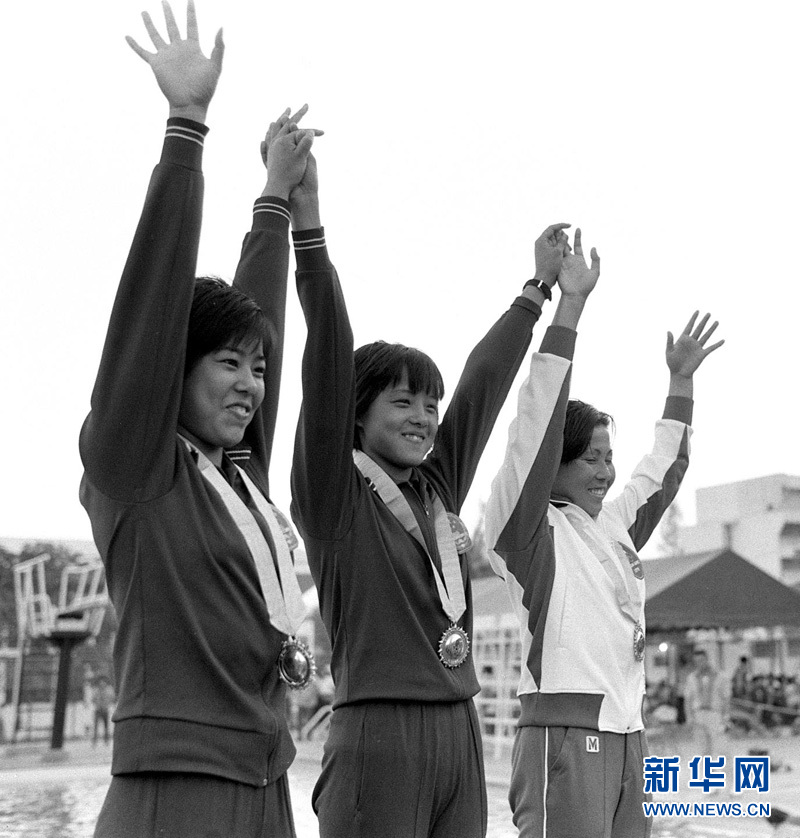 1981年,史美琴在墨西哥舉行的第二屆世界杯跳水比賽中獲得女子三米跳板金牌,成為中國第一位跳水世界冠軍。圖為1978年12月,獲得第八屆亞運會女子三米跳板跳水冠軍的史美琴(中)在頒獎儀式上。新華社發