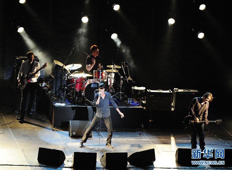 8月7日晚,樂隊主唱布萊特·安德森和樂隊演繹經(jīng)典歌曲。當(dāng)晚,著名英倫搖滾樂隊山羊皮(Suede)在北京工人體育館舉行了世界巡演中國站的首場演出,下一場將于9號在上海舉行。這次巡演是該樂隊在解散八年之后以經(jīng)典五人陣容重組后的首次巡演。新華社記者肖瀟攝