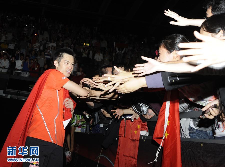 8月14日,林丹(左)接受祝賀。當天,在英國倫敦舉行的2011年羽毛球世界錦標賽男單決賽中,中國選手林丹以2比1戰勝馬來西亞選手李宗偉,第四次奪得世錦賽冠軍。新華社記者曾毅攝