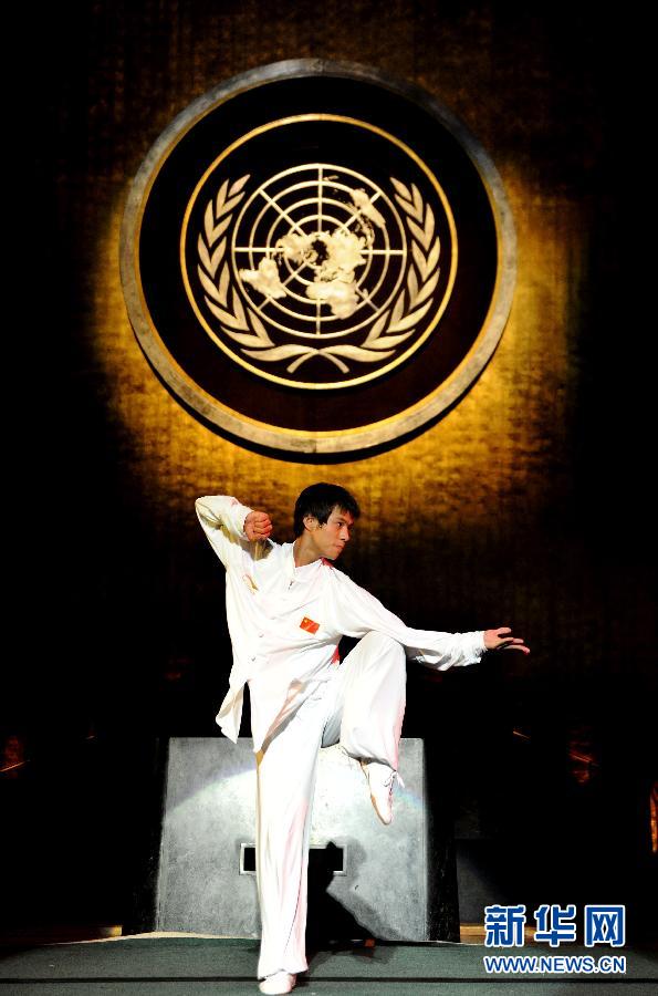 當日,正在美國訪問的中國武術協會代表團在紐約聯合國總部舉行主題為“和平、友誼、健康”的武術專場表演。 新華社記者申宏