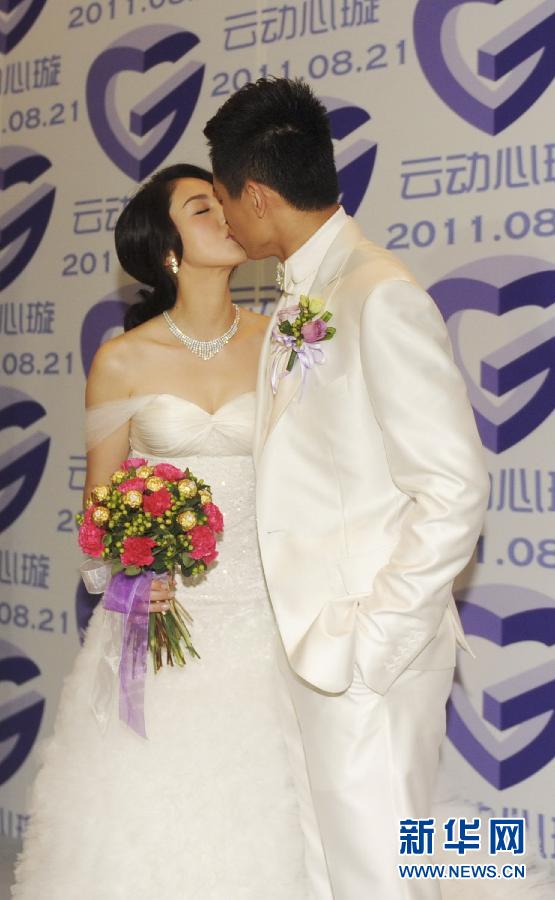 8月21日,董璇(左)、高云翔在婚禮上甜蜜親吻。當(dāng)日,董璇和高云翔在北京柏悅酒店舉行婚禮,眾多演藝明星到場祝福。 新華社發(fā)(杜英輝 攝)