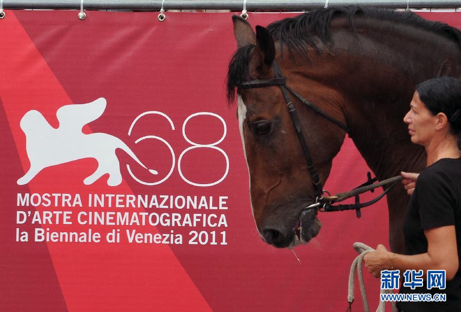 9月5日,在意大利威尼斯利多島,意大利電影《馬》中的駿馬亮相威尼斯電影節紅地毯,助陣首映禮。 新華社記者王慶欽攝