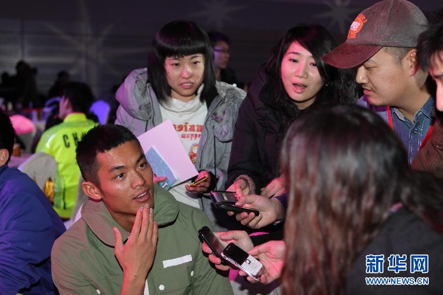 2月1日,中國羽毛球隊男單運動員林丹(左)在春節聯歡會前接受記者采訪。當日,中國羽毛球隊2012年新春聯歡會在國家體育總局羽排館進行。新華社記者張晨攝