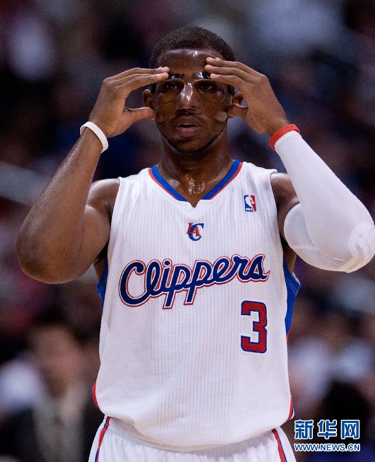 3月11日,快船隊球員保羅在比賽中戴上面具。當日,在2011-2012賽季NBA常規賽中,洛杉磯快船隊主場對陣金州勇士隊。新華社記者楊磊攝