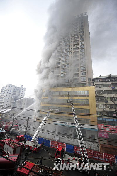 當日9時28分左右,武漢漢正街利濟南路25號硚房大廈發生火災,消防部門接報后迅速調集10個消防中隊、67臺消防車、200名消防人員趕到現場施救。目前樓中被困和傷亡人數仍不清楚,事故原因正在調查之中。截至發稿時,大火仍在繼續。新華社記者 郝同前 攝