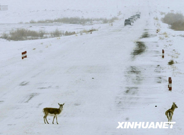 兩只鵝喉羚在積雪覆蓋的公路上覓食(1月9日攝)。 近日,在零下30多攝氏度的寒風中,一群群饑腸轆轆的鵝喉羚沿著216國道兩側緩慢南行。持續數日的大雪嚴寒、積雪太厚,無法吃到被積雪覆蓋的衰草,新疆準噶爾盆地腹地的新疆卡拉麥里自然保護區的野生動物陡然落入“饑寒交迫”的困境。由于饑寒難耐,生息在阿勒泰草原和準噶爾北緣的野生動物紛紛南遷,大批進入盆地腹地尋找生計。新華社記者 沈橋 攝