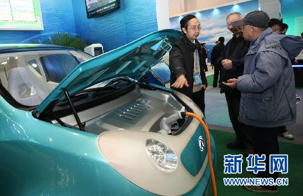 3月9日,工作人員向參觀者講解電動汽車的充電原理。正在北京舉行的“十一五”國家重大科技成就展中的新能源汽車展區(qū)受到參觀者歡迎。該展區(qū)主要從整車及關(guān)鍵零部件研發(fā)、能源供給體系及基礎(chǔ)設(shè)施建設(shè)、“十城千輛”工程三個方面展示“十一五”期間節(jié)能與新能源汽車所取得的各項成果。新華社發(fā)(萬象 攝)