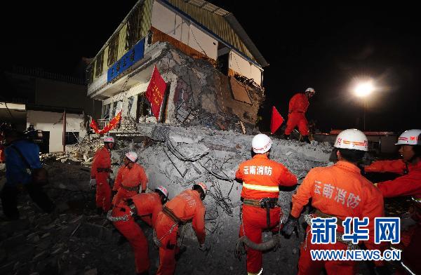 3月11日凌晨,消防官兵在云南盈江地震災(zāi)區(qū)搜救幸存者。 3月10日,云南省盈江縣發(fā)生5.8級(jí)地震。截至11日零時(shí),地震已致25人死亡,包括4名學(xué)生,250余人受傷。云南省救災(zāi)工作組及各救援隊(duì)已抵達(dá)災(zāi)區(qū),各項(xiàng)救災(zāi)工作正有序展開。新華社記者 秦晴攝