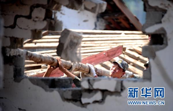 3月12日,駐滇集團(tuán)軍某團(tuán)戰(zhàn)士在盈江地震受災(zāi)最嚴(yán)重的勐町村拉勐寨拆除被毀房屋。