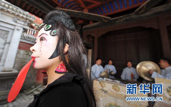 “鬼戲”演出多在夜晚,其中的男鬼、女鬼、無常、判官等角色或詭異、或恐怖、或可愛、或逗樂,在中國戲劇史上是一種另類的風景。魯迅先生在雜文《無常》《女吊》中對故鄉“鬼戲”的贊美讓這種“戲曲的活化石”引起世人的關注。鬼戲在上世紀二十年代后日漸式微,八、九十年代后基本滅絕,2006年目連戲列入全國非物質文化遺產名錄,近年來,全國各地的目連戲開始“復活”。 新華社記者 王定昶攝