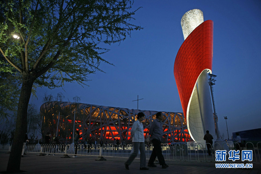 4月15日,奧運火炬亮起夜景燈光。當日,國家體育場“鳥巢”東北側的火炬廣場正式對公眾開放。晚6時30分,火炬廣場的數十盞祥云浮雕射燈、埋地燈、LED燈等夜景照明設施全面開啟,火炬廣場成為奧運周邊的新景觀。新華社發(李方宇 攝)
