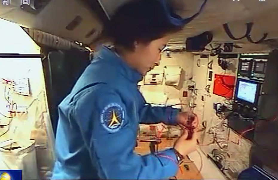 6月24日,神舟九號在完成首次手控交會對接之后,三名航天員重返天宮,繼續開展空間實驗。圖為臨睡前,劉洋手里擺弄著絲繩,正在編織中國結。中新社發