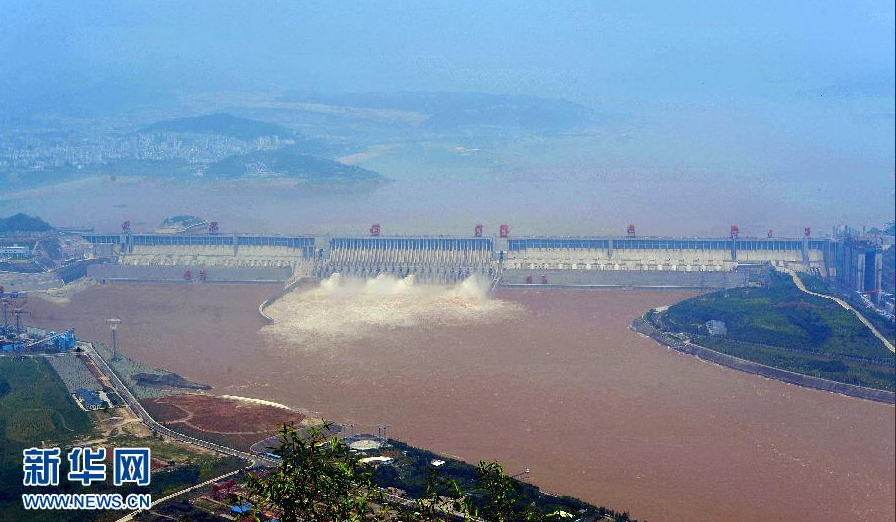 7月7日,三峽大壩開啟4個泄洪深孔泄洪。當日,形成于長江上游的2012年“1號洪峰”抵達三峽水域,流量高達每秒5.6萬立方米,創今年汛期來水新高。洪峰到來時,三峽樞紐積極攔蓄洪水,水庫水位漲幅明顯,7日上午漲至151米以上,高出防洪限制水位6米,創今年汛期水位新高。新華社發(鄭家裕 攝)