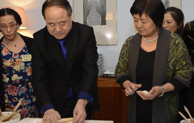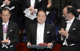 12月8日中午,2012年諾貝爾文學獎得主莫言在諾貝爾故居與瑞典華人華僑相聚一堂。據當地僑領介紹,位于斯德哥爾摩近郊的百樂門賓館曾經是諾貝爾故居。在當天的歡迎宴會上,當地華僑向莫言贈送禮物,莫言高興地看著自己的畫像。中新社發 沈晨 攝