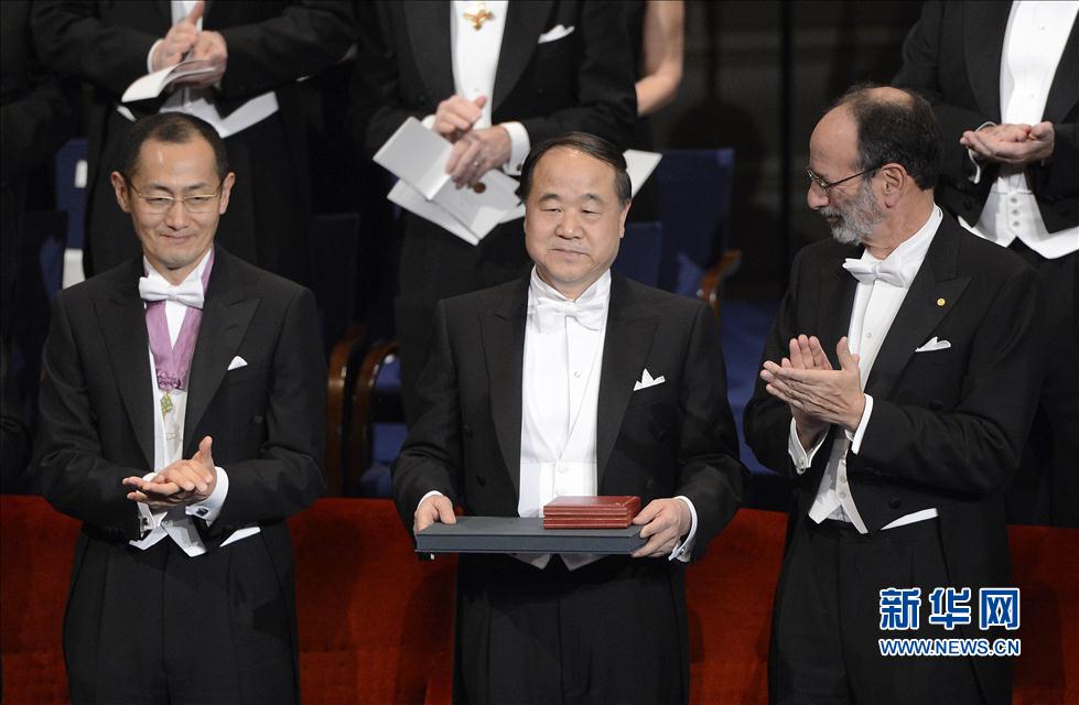12月10日,在瑞典首都斯德哥爾摩音樂廳舉行的2012年諾貝爾獎頒獎儀式上,中國作家莫言(前)領取諾貝爾文學獎。 新華社記者武巍攝